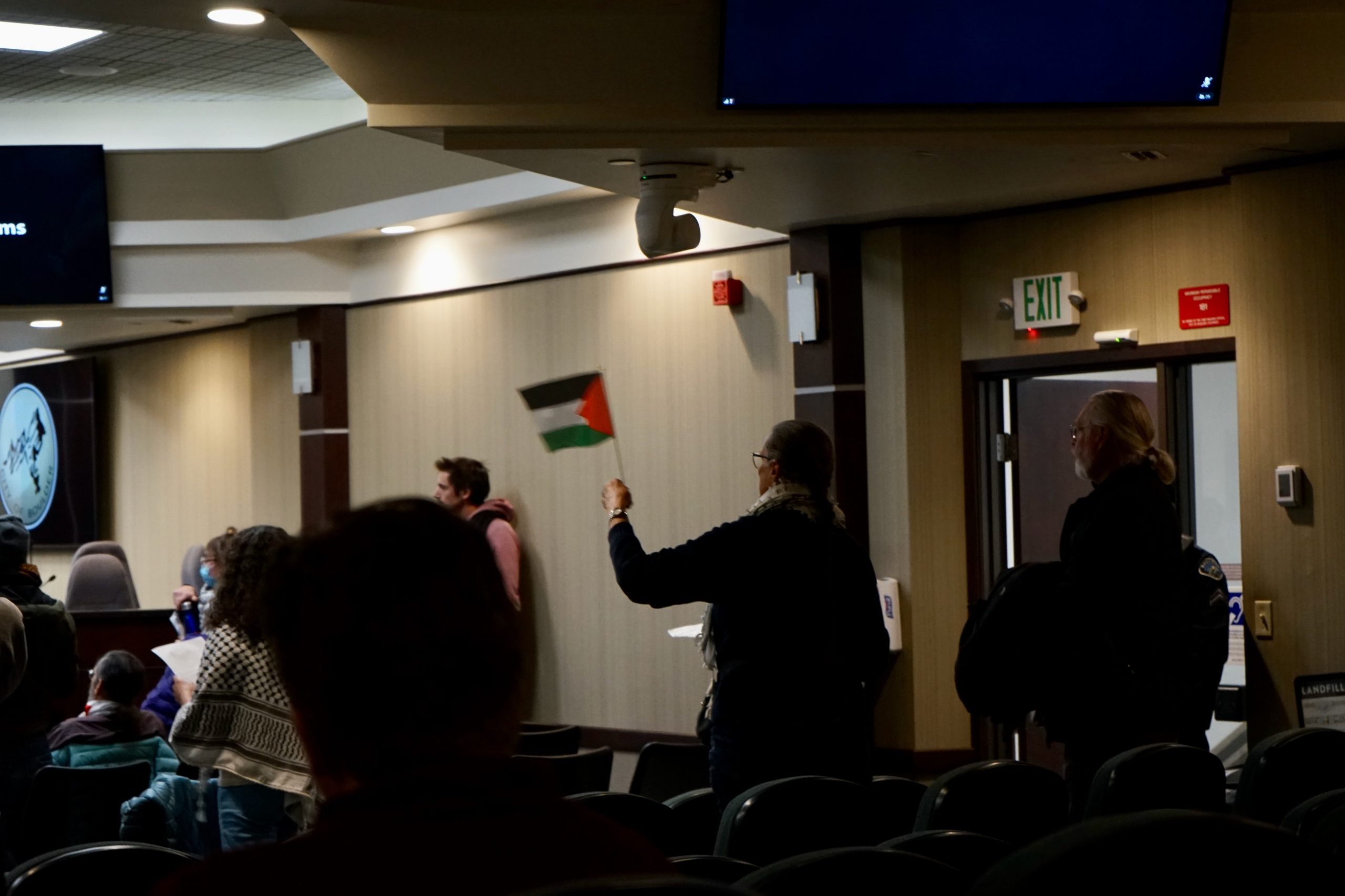 In May, in response to attendees advocating for a ceasefire resolution, councilmembers adopted new rules to prevent large flag waving and holding up posters that block people’s views.