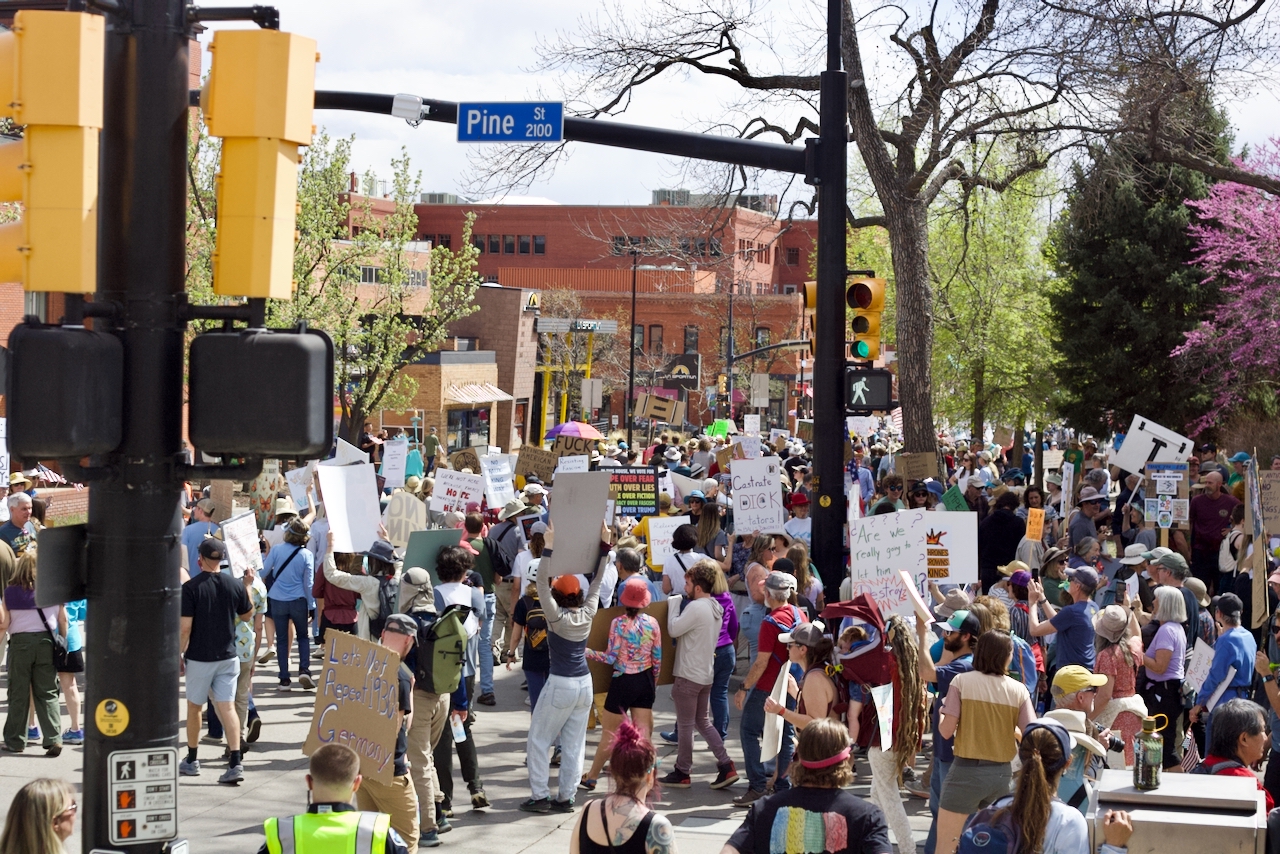 Crowds packed downtown streets as the city closed sections of Canyon Boulevard, 9th Street, Pine Street and Broadway for about two hours. Boulder police managed traffic at key intersections during the march.